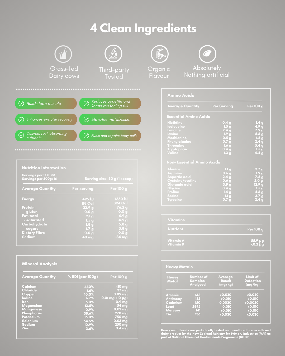 New Zealand Whey Protein Concentrate with Emulsifier (non-GMO Sunflower Lecithin), Organic Ground Vanilla Beans, Natural Sweetener (Thaumatin).